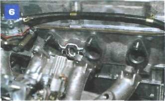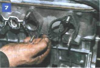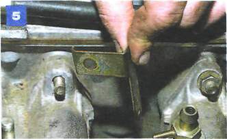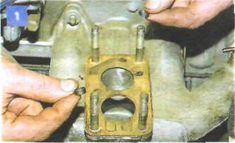 Снятие впускной трубыСливаем охлаждающую жидкость (см. «Замена охлаждающей жидкости на автомобиле с двигателем УМПО-331»). Снимаем карбюратор (см. «Снятие карбюратора» ). ![]() Снимаем две центрирующие втулки карбюратора, установленные на диагонально расположенных шпильках крепления карбюратора. ![]() Снимаем со штуцера, ввернутого в патрубок четвертого цилиндра впускной трубы, трубку электропневмоклапана системы ЭПХХ и, ослабив хомут, снимаем шланг вакуумного усилителя тормозов. ![]() Ослабив хомут, отсоединяем шланг отвода охлаждающей жидкости от штуцера, ввернутого в прилив впускной трубы под карбюратором. ![]() Головкой «на 13» отворачиваем гайку крепления впускной трубы к головке блока цилиндров, крепящую одновременно кронштейн возвратной пружины дроссельных заслонок карбюратора. ![]() Снимаем кронштейн. ![]() Снимаем впускную трубу. ![]() Снимаем три уплотнительных прокладки стыков патрубков впускной трубы с впускными каналами головки блока цилиндров. Очищаем привалочные плоскости стыков впускной трубы и головки блока цилиндров от остатков старых прокладок и герметика. Устанавливаем новые прокладки. При этом среднюю из трех прокладок, уплотняющую стыки патрубков второго и третьего цилиндров, а также канал подвода охлаждающей жидкости к впускной трубе, смазываем тонким слоем герметика. Устанавливаем впускную трубу в обратной последовательности. |