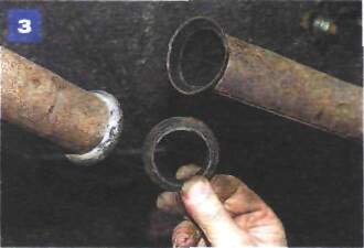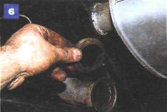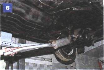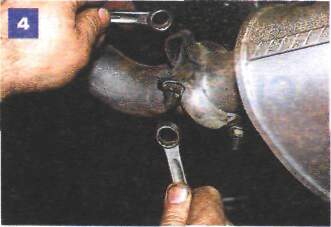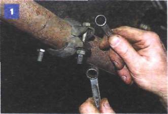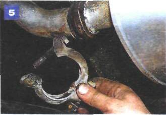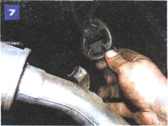 Снятие резонатораРаботу выполяем на смотровой канаве или подъемнике. ![]() Удерживая болт от проворачивания накидным ключом «на 12», накидным ключом «на 13» отворачиваем гайку стяжного болта хомута крепления резонатора к приемной трубе. ![]() Снимаем хомут. ![]() Разъединяем стык приемной трубы и трубы резонатора и вынимаем металлическое уплотнительное кольцо. ![]() Удерживая болт от проворачивания накидным ключом «на 12», накидным ключом «на 13» отворачиваем гайку хомута крепления резонатора к глушителю. ![]() Снимаем хомут. ![]() Стык резонатора и глушителя также уплотнен металлическим кольцом. ![]() Снимаем с крюка резонатора подушку подвески... ![]() ...и снимаем резонатор. Устанавливаем детали в обратной последовательности. При затяжке хомутов крепления следим за тем, чтобы детали выпускной системы не касались кузова. |